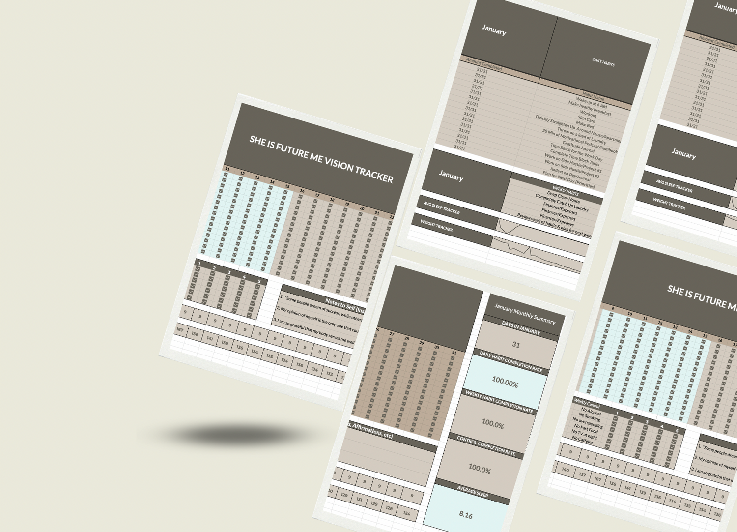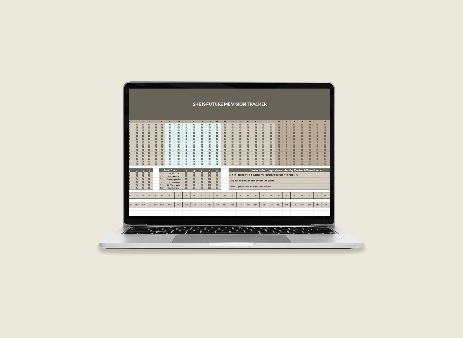"I've struggled with accountability for my entire life, whether it was working out, eating healthy, fully completing all the tasks I needed done for the day, etc. The "She is Future Me" vision tracker truly helped me gain this accountability. It made me reach my goals, because I couldn't stand not to see my percentages increase each day. Thank you!"